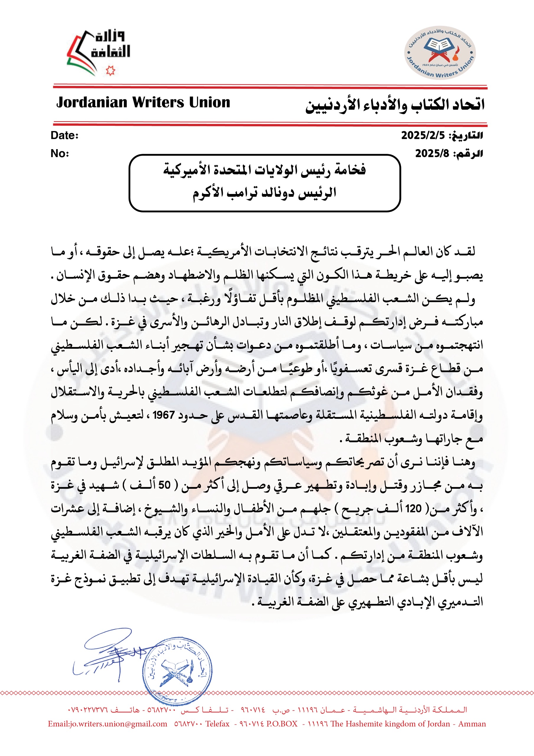 الرئيسية/اتحاد الكتاب الأردنيين يرفض التهجير ويؤكد دعم القضية الفلسطينية/IMG-20250205-WA0014 IMG-20250205-WA0014