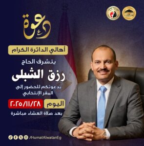 يسعدنا ويشرفنا حضوركم الكريم اليوم الجمعة بعد صلاة العشاء، بالمقر الانتخابي بليسا الجمالية..عزبة الشبلي
