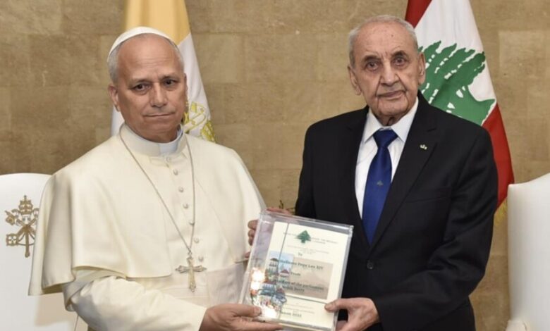 أهدى رئيس مجلس النواب اللبناني نبيه بري البابا لاوون الرابع عشر كتاباً بعنوان “على خطى يسوع المسيح في لبنان”، موضحاً خلال اللقاء أن أولى معجزات السيد المسيح جرت في مدينة صور جنوب لبنان. وخلال الخلوة التي جمعتهما في قصر بعبدا، تحدث بري عن معاناة أبناء الجنوب في ظل الاعتداءات الإسرائيلية المتواصلة، وما تسببه من تهجير واستهداف للمدنيين والبلدات الحدودية، مشدداً على ضرورة حماية السكان ودعم حقهم في العيش بسلام وأمان.