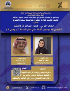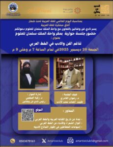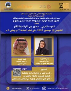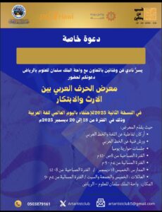 بمناسبة *اليوم العالمي للغة العربية*، نظّم *نادي فن وفنانين* بالتعاون مع *واحة الملك سلمان للعلوم*، فعاليات ثقافية وفنية خلال الفترة المسائية من *18 – 20 ديسمبر 2025*، تحت شعار: *”الحرف العربي.. جسور بين التراث والابتكار”*، بمقر الواحة في مدينة الرياض، من الساعة 7 إلى 9 مساءً.