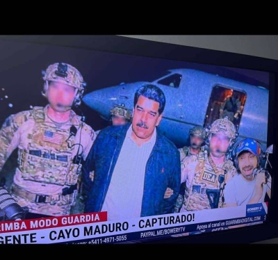 تناولت وسائل إعلام أمريكية، اليوم السبت، صورة نُسبت إلى لحظة اعتقال الرئيس الفنزويلي نيكولاس مادورو، ظهر فيها مقيّد اليدين بينما يقتاده عنصران من قوات دلتا الأمريكية إلى مكان احتجازه.