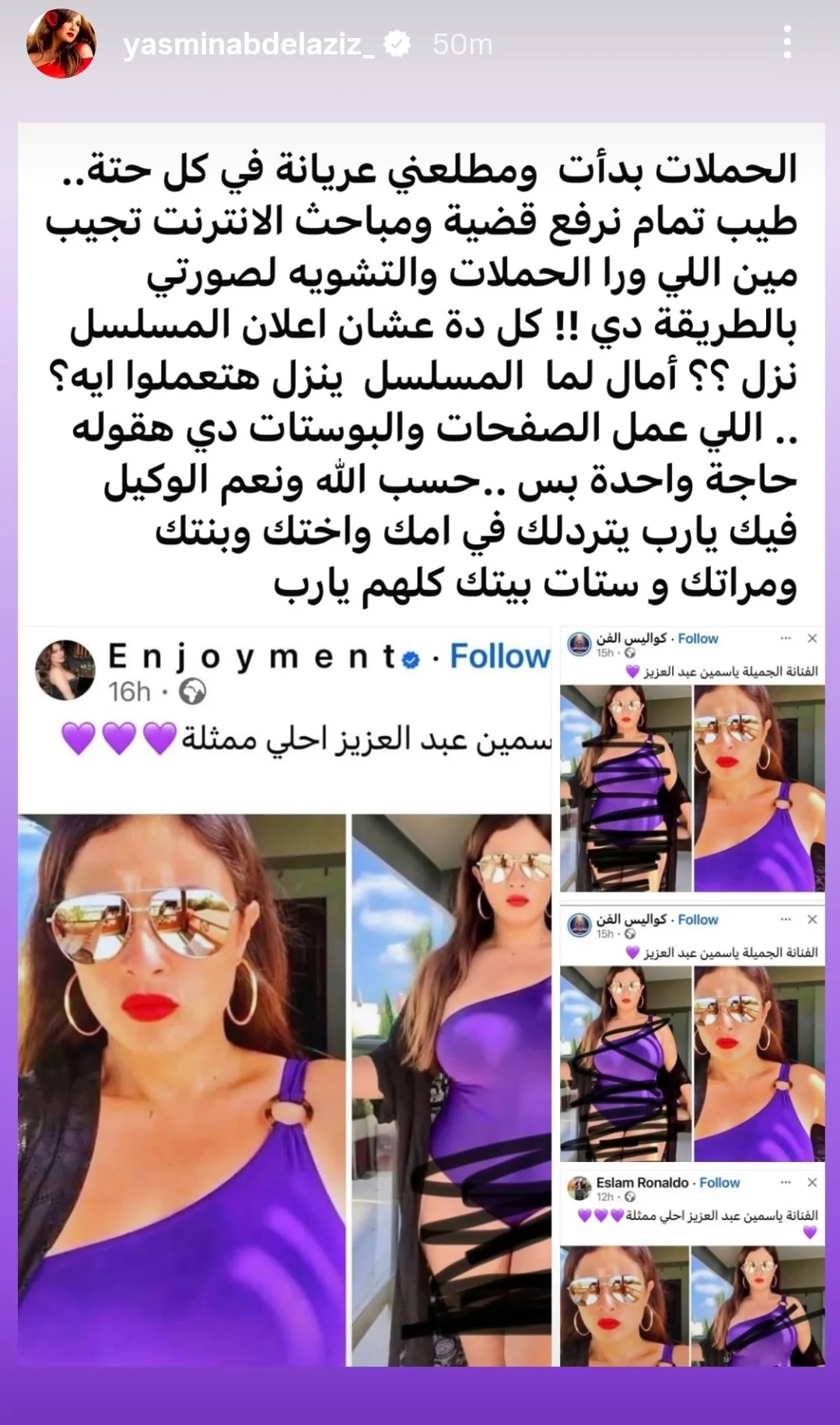 وكتبت ياسمين عبر صفحتها الرسمية على موقع فيسبوك: “الحملات بدأت ومطلعنّي عريانة في كل حتة.. طيب تمام نرفع قضية ومباحث الإنترنت تجيب مين اللي ورا الحملات والتشويه لصورتي بالطريقة دي!!”، مشددة على أنها ستتابع الإجراءات القانونية للوصول إلى المسؤولين عن هذه الأعمال.