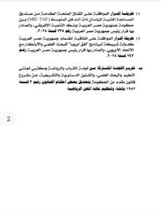 ثالثاً: مناقشة عدد من الاتفاقيات الدولية (منح) على النحو الآتي: – قرار رئيس الجمهورية رقم ٥٨٢ لسنة ٢٠٢٥ بشأن الموافقة على الخطابات المتبادلة بين حكومة جمهورية مصر العربية وحكومة اليابان بشأن المنحة المقدمة من وكالة اليابان للتعاون الدولي (جايكا) لمشروع “توفير سفينة دعم الغوص” .. – قرار رئيس الجمهورية رقم ٦٥١ لسنة ٢٠٢٥ بشأن الموافقة على الخطابات المتبادلة الخاصة بمنحة مشروع “تطوير تكنولوجيا صيانة السيارات الخضراء (صديقة البيئة) لمراكز التدريب المهني في مصر” بين حكومة جمهورية مصر العربية وحكومة جمهورية كوريا .. – قرار رئيس الجمهورية رقم ٧٣٠ لسنة ٢٠٢٥ بشأن الموافقة على الاتفاق التمويلي (منحة) الخاص ببرنامج دعم تنفيذ الإصلاحات الاجتماعية والاقتصادية على المستوى المحلي بين حكومة جمهورية مصر العربية والاتحاد الأوروبي .. – قرار رئيس الجمهورية رقم ٧٣٥ لسنة ٢٠٢٥ بشأن الموافقة على اتفاق المنحة المقدمة من صندوق المساعدة الفنية للبلدان ذات الدخل المتوسط (MIC-TAF) بين حكومة جمهورية مصر العربية وبنك التنمية الإفريقي. – قرار رئيس الجمهورية رقم ٧٤٢ لسنة ٢٠٢٥ بشأن الموافقة على اتفاقية انضمام جمهورية مصر العربية كدولة شريكة لبرنامج “أفق أوروبا” للبحث العلمي والابتكار مع الاتحاد الأوروبي ..