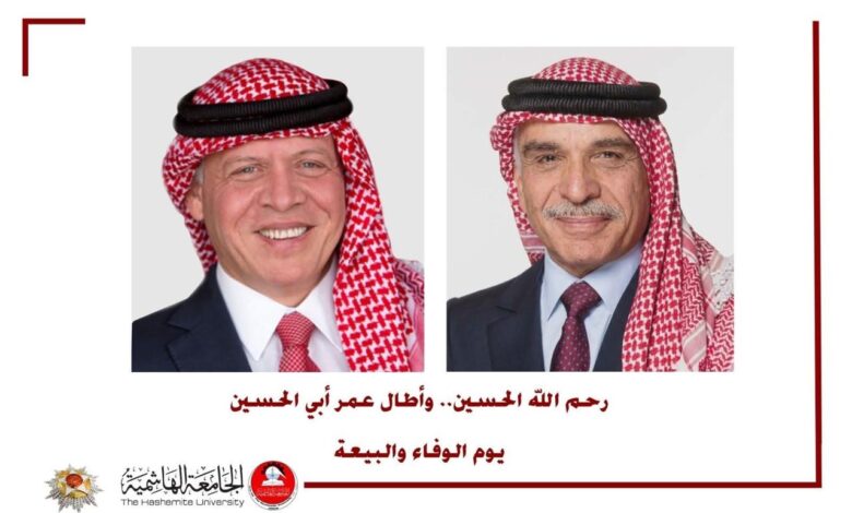 وتستحضر الجامعة الهاشمية في يوم الوفاء والبيعة بكل فخر واعتزاز المسيرة التاريخية الحافلة بالعطاء والإنجاز لجلالة للملك الراحل الحسين بن طلال، طيب الله ثراه، والتي امتدت لما يقارب نصف قرن، وأرست نهجًا وطنيًا راسخًا، جسّد قيم الحكمة والشجاعة والاعتدال، ورسّخ مكانة الأردن نموذجًا في الاستقرار والتقدم والاحترام بين الأمم.