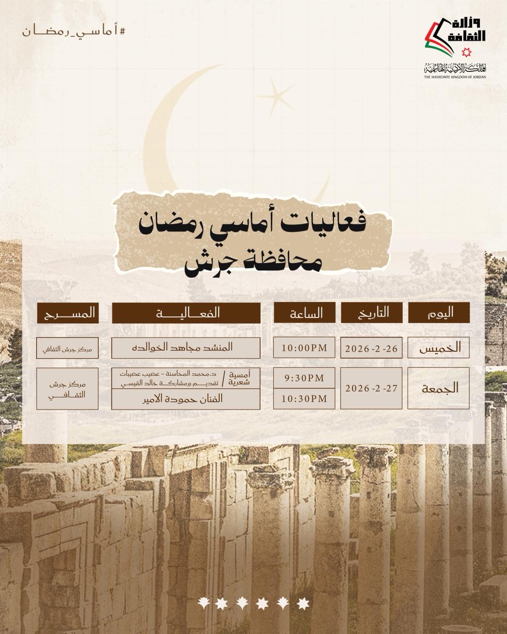 الرئيسية/وزارة الثقافة تواصل «أماسي رمضان» في عدد من المحافظات يومي الخميس والجمعة من كل أسبوع/IMG-20260224-WA0023 IMG-20260224-WA0023