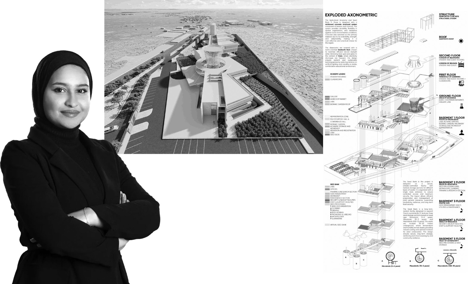 وتميز مشروع الطالبة اللواما بنهج معماري طموح ومتعدد الطبقات يدمج الأمن الغذائي، وحفظ التنوع الحيوي والتعليم المجتمعي في منظومة عمودية متكاملة حيث يستثمر الأقبية المتعددة لإنشاء بنك بذور مناخياً متحكم به، بينما تستضيف المستويات العليا أنظمة زراعية ومائية مبتكرة تحول المناخ الجاف إلى مورد إنتاجي، كما أن التصميم أظهر نُضجاً تقنياً واستراتيجياً استثنائياً من خلال التحليل الجيوفيزيائي الدقيق الذي يوجه التشكيل المعماري مع خلق خط مقاومة رمزي وفعلي يربط بين الحفاظ على الموارد الوراثية وجمع المياه الجوفية والمحور التعليمي/ المجتمعي في رحلة مكانية خطية تجسد السرديات المتشابكة للصمود والبقاء والتجديد.