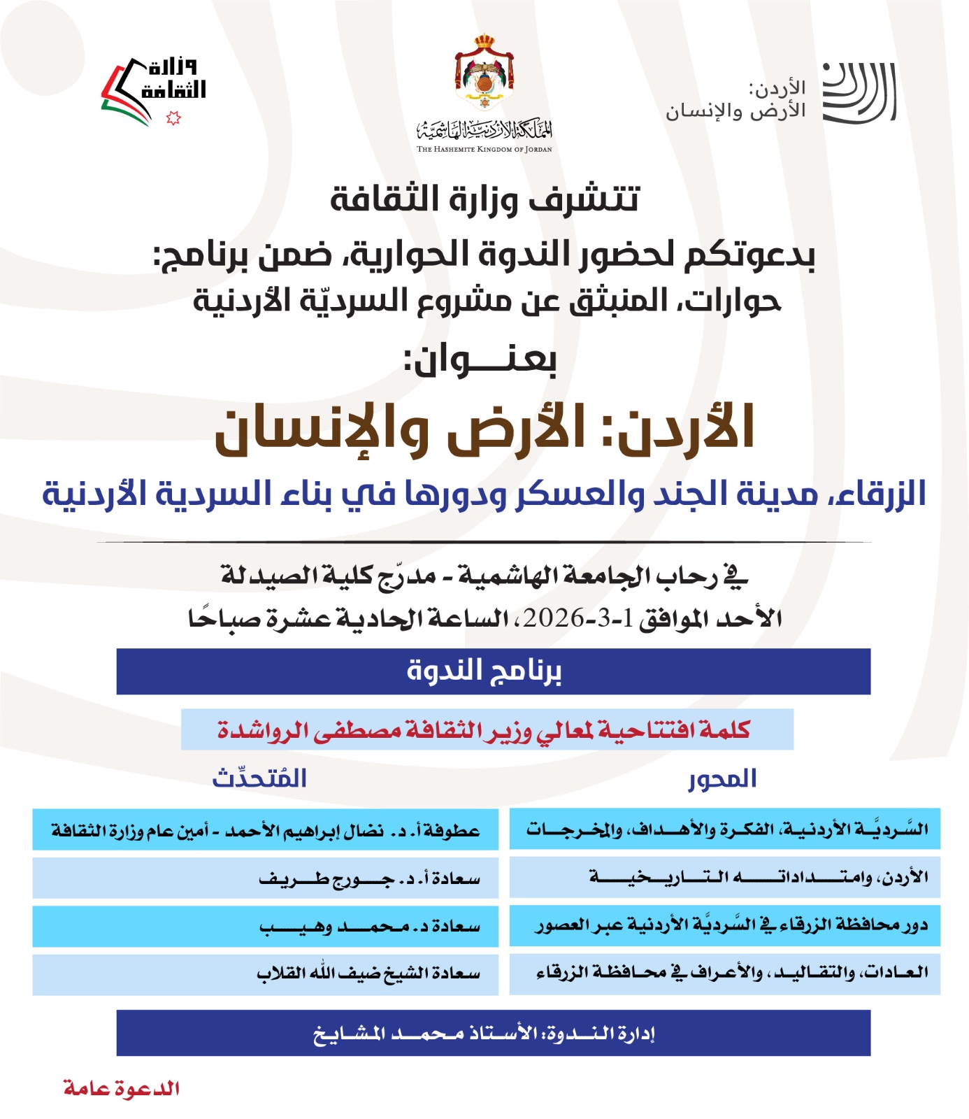 تعقد وزارة الثقافة ضمن برنامج حوارات المنبثق عن مشروع السردية الأردنية ندوة حوارية بعنوان “الأردن .. الأرض والإنسان.. الزرقاء مدينة الجند والعسكر ودورها في بناء السردية الأردنية” يوم الأحد المقبل في الجامعة الهاشمية، الساعة الحادية عشرة صباحا.
