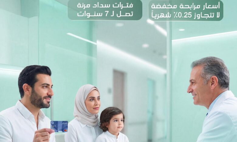 وتمثل البطاقة نموذجاً رائداً في التمويل الصحي؛ حيث يعزز البنك من خلالها قدرة المتعاملين على تغطية النفقات الطبية لعلاجهم وعلاج أفراد عائلاتهم لدى شبكة واسعة من المستشفيات والمراكز الطبية، مع إمكانية تقسيط المدفوعات المترتبة عليها لغاية سبع سنوات، وبنسبة مرابحة قياسية تبلغ 2.99% مقابل رسوم رمزية شهرية.