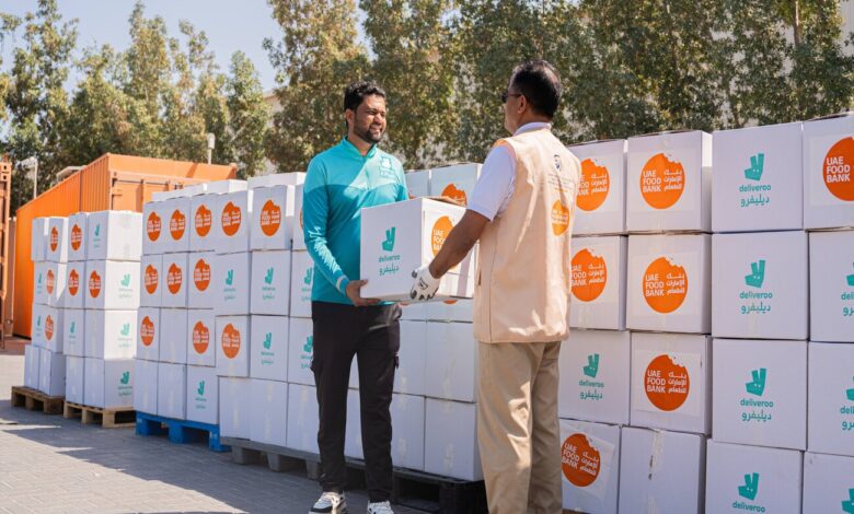 موظفو ديليفرو وبنك الإمارات للطعام يجهّزون ويوزّعون صناديق مواد غذائية على جميع السائقين ضمن أسطولها
