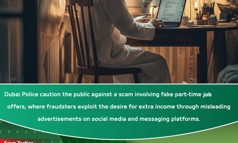 حذّرت شرطة دبي أفراد المجتمع من أسلوب احتيالي متزايد في الآونة الأخيرة، يعتمد على إيهام الضحايا بوجود فرص عمل جزئي، ويستغل فيه المحتالون رغبة الضحايا في تحسين دخلهم، عبر عروض وظيفية وهمية يتم الترويج لها من خلال منصات التواصل الاجتماعي أو تطبيقات المراسلة.