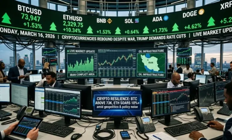 شهدت أسعار العملات المشفرة ارتفاعاً لافتاً يوم الاثنين 16 مارس 2026، وسط مرونة غير متوقعة للأسواق في ظل تأثيرات الحرب في إيران، ومطالبة الرئيس الأميركي بعقد اجتماع عاجل مع مسؤولي الفيدرالي الأميركي لخفض الفائدة فوراً.