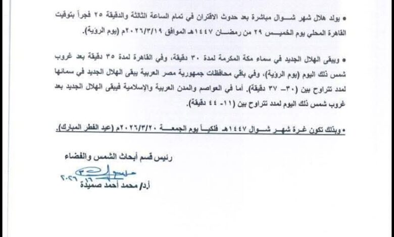 أعلن المعهد القومي للبحوث الفلكية أن غرة شهر شوال وأول أيام عيد الفطر المبارك لعام 1447هـ ستكون فلكياً يوم الجمعة الموافق 20 مارس 2026، وذلك بعد ثبوت تولد الهلال يوم الخميس 19 مارس وبقائه في سماء القاهرة ومكة المكرمة لمدد تتراوح بين 30 و35 دقيقة بعد غروب الشمس