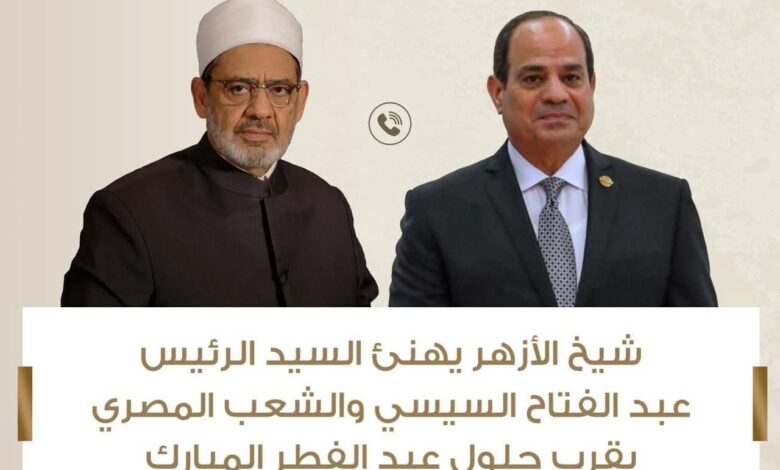 من جهته .. هنأ سيادة الرئيس عبد الفتاح السيسي شيخ الأزهر بعيد الفطر المبارك، داعيًا المولى عز وجل أن يعيده على فضيلته والأمتين العربية والإسلامية بالأمن والأمان والاستقرار، كما حرص سيادته على الاطمئنان على صحة شيخ الأزهر، داعيًا المولى عز وجل أن يمد في عمره وأن يديم على فضيلته نعمتي الصحة والعافية، مشيدًا سيادته بالدور الذي يقوم به الأزهر الشريف في نشر الوعي الصحيح.