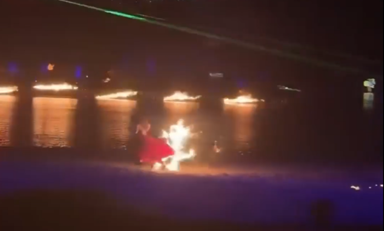 وسارعت الراقصة إلى الفرار باتجاه المياه، حيث ألقت بنفسها في النهر في محاولة لإخماد الحريق، في مشهد درامي وثّقته الكاميرات.